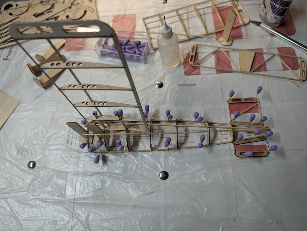 | hjlittman | 25-Jan-26 00:45 | | Now, to put this together. I glued the stub spars in place to the formers before I glued the formers in place. With all the formers on this side of the model I made sure they were perpendicular to the keels by using right angle tools. (See previous post.). Since there is no space for a side keel, which would have to go right through the wing, the stringers above and below the wing position act a side keels. To ensure that the spacing between the two wing mount formers remains correct I slipped the wing over the stub spars before attaching the stringers. |