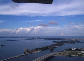 Looking WNW across the bay over to Miami Beach. The 'twin towers' near the center are the Blue and Green Diamond towers on Collins Ave, and the Venetian and McArthur causeways are in the foreground.